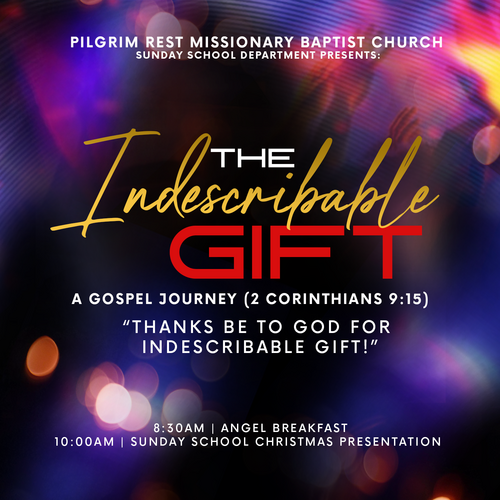 Join us as the Sunday School Department presents “The Indescribable Gift,” a heartfelt Christmas program celebrating God’s greatest gift to the world—Jesus Christ. Through scripture, music, and spoken word, our children and youth will remind us why His birth still fills our lives with hope, joy, and love.